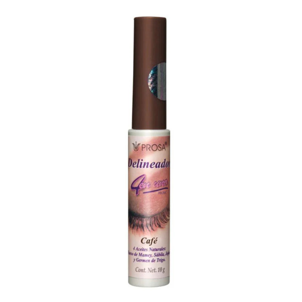 Delineador 4 en Uno de Prosa en tono café, con 4 aceites naturales: Hueso de mamey, Sábila, Jojoba y Germen de Trigo.